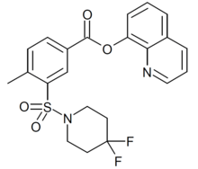 2F-QMPSB (SGT-13) is an arylsulfonamide-based synthetic cannabinoid that is a fluorinated derivative of QMPSB and has been sold as a designer drug. Its identification was first reported by a forensic laboratory in Italy in January 2019,[1] and it was made illegal in Latvia shortly afterwards.[2][3] Fluorination of the tail group is a common strategy to increase potency at cannabinoid receptors which is seen in many related series of compounds.[4][5]