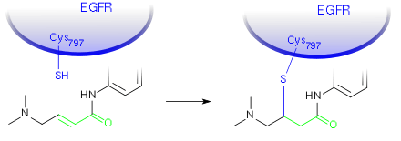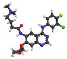 Like lapatinib and neratinib, afatinib is a protein kinase inhibitor that also irreversibly inhibits human epidermal growth factor receptor 2 (Her2) and epidermal growth factor receptor (EGFR) kinases. Afatinib is not only active against EGFR mutations targeted by first generation tyrosine-kinase inhibitors (TKIs) like erlotinib or gefitinib, but also against less common mutations which are resistant to these drugs. However, it is not active against the T790M mutation which generally requires third generation drugs like osimertinib.[11] Because of its additional activity against Her2, it is being investigated for breast cancer as well as other EGFR and Her2 driven cancers.[2]