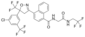 | Other names | 4-[(5RS)-5-(5-Chloro-α,α,α-trifluoro-m-tolyl)-4,5-dihydro-5-(trifluoromethyl)-1,2-oxazol-3-yl]-N-[2-oxo-2-(2,2,2-trifluoroethylamino)ethyl]naphthalene-1-carboxamide |
