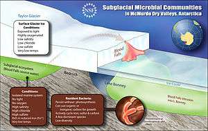 Chemical and microbial analyses both indicate that a rare subglacial ecosystem of autotrophic bacteria developed that metabolizes sulfate and ferric ions.[3][4] According to geomicrobiologist Jill Mikucki at the University of Tennessee, water samples from Blood Falls contained at least 17 different types of microbes, and almost no oxygen.[3] An explanation may be that the microbes use sulfate as a catalyst to respire with ferric ions and metabolize the trace levels of organic matter trapped with them. Such a metabolic process had never before been observed in nature.[3]