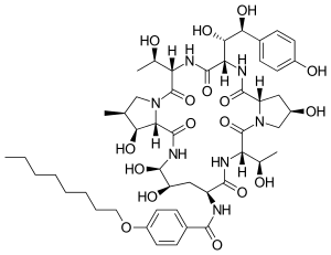 N-[(11R,20R,21R,25S,26S)-6-[(1S,2S)-1,2-Dihydroxy-2-(4-hydroxyphenyl)ethyl]-11,20,21,25-tetrahydroxy-3,15-bis(1-hydroxyethyl)-26-methyl-2,5,8,14,17,23-hexaoxo-1,4,7,13,16,22-hexaazatricyclo[22.3.0.09,13]heptacosan-18-yl]-4-(octyloxy)benzamide | |
