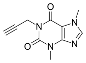 DMPX (3,7-dimethyl-1-propargylxanthine) is a caffeine analog which displays affinity to A2 adenosine receptors, in contrast to the A1 subtype receptors.[1] DMPX had 28× and 15× higher potency than caffeine in blocking peripheral and central NECA-responses. The locomotor stimulation caused by DMPX (ED50 10 μmol/kg) was similarly higher than caffeine.[1]