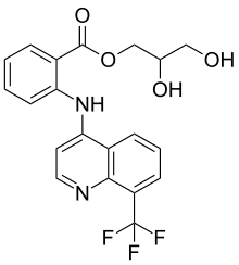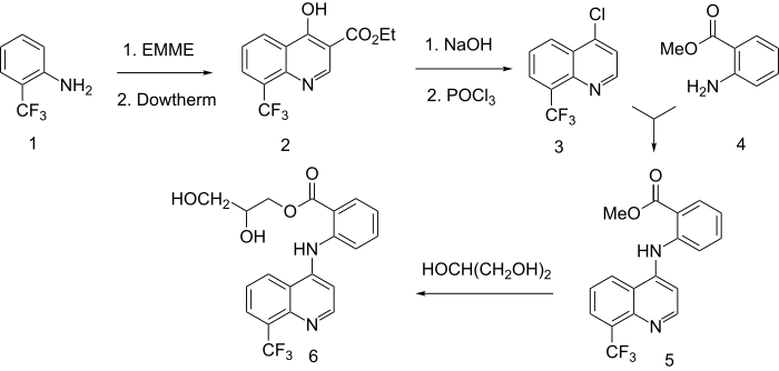 The scheme involves first the conversion of ortho-trifluoromethyl aniline (1) to a quinolol. The compound is thus condensed with EMME (Ethoxy Methylene Malonic Diethyl Ester) and cyclized thermally (2). That intermediate is then saponified; the resulting acid is decarboxylated and finally converted to the 4-chloroquinoline (3) by reaction with phosphorus oxychloride. The displacement of chlorine with methyl anthranilate (4) then affords the coupled intermediate (5). An ester interchange of that product with glycerol leads to the glyceryl ester. There is thus obtained the NSAID floctafenine.