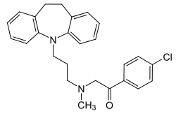 Lofepramine is a tricyclic compound, specifically a dibenzazepine, and possesses three rings fused together with a side chain attached in its chemical structure.[29] Other dibenzazepine TCAs include imipramine, desipramine, clomipramine, and trimipramine.[29][30] Lofepramine is a tertiary amine TCA, with its side chain-demethylated metabolite desipramine being a secondary amine.[31][28] Unlike other tertiary amine TCAs, lofepramine has a bulky 4-chlorobenzoylmethyl substituent on its amine instead of a methyl group.[30] Although lofepramine is technically a tertiary amine, it acts in large part as a prodrug of desipramine, and is more similar to secondary amine TCAs in its effects.[32] Other secondary amine TCAs besides desipramine include nortriptyline and protriptyline.[33][32] The chemical name of lofepramine is N-(4-chlorobenzoylmethyl)-3-(10,11-dihydro-5H-dibenzo[b,f]azepin-5-yl)-N-methylpropan-1-amine and its free base form has a chemical formula of C26H27ClN2O with a molecular weight of 418.958 g/mol.[2] The drug is used commercially mostly as the hydrochloride salt; the free base form is not used.[2][3] The CAS Registry Number of the free base is 23047-25-8 and of the hydrochloride is 26786-32-3.[2][3]