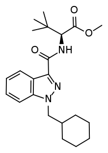 MDMB-CHMINACA (also known as MDMB(N)-CHM) is an indazole-based synthetic cannabinoid that acts as a potent agonist of the CB1 receptor,[1] and has been sold online as a designer drug.[2][3][4][5][6] It was invented by Pfizer in 2008, and is one of the most potent cannabinoid agonists known, with a binding affinity of 0.0944 nM at CB1, and an EC50 of 0.330 nM.[7] It is closely related to MDMB-FUBINACA, which caused at least 1000 hospitalizations and 40 deaths in Russia as consequence of intoxication.[8]