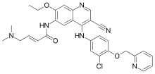Like lapatinib and afatinib, it is a dual inhibitor of the human epidermal growth factor receptor 2 (Her2) and epidermal growth factor receptor (EGFR) kinases.[5][6] It inhibits them by covalently binding with a cysteine side chain in those proteins.[7] Unlike related noncovalent inhibitors, neratinib is effective against the T790M resistant variant of EGFR.[8]