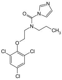 Prochloraz, brand name Sportak, is an imidazole fungicide that was introduced in 1978[3] and is widely used in Europe, Australia, Asia, and South America within gardening and agriculture to control the growth of fungi.[4][5] It is not registered for use in the United States.[5] Similarly to other azole fungicides, prochloraz is an inhibitor of the enzyme lanosterol 14α-demethylase (CYP51A1), which is necessary for the production of ergosterol – an essential component of the fungal cell membrane – from lanosterol.[6] The agent is a broad-spectrum, protective and curative fungicide, effective against Alternaria spp., Botrytis spp., Erysiphe spp., Helminthosporium spp., Fusarium spp., Pseudocerosporella spp., Pyrenophora spp., Rhynchosporium spp., and Septoria spp.[5][2]