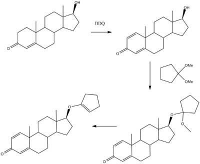 Quinbolone can be prepared from testosterone. Dehydrogenation using DDQ forms boldenone. Reaction with 1,1-dimethoxycyclopentane followed by heating to eliminate methanol gives quinbolone.