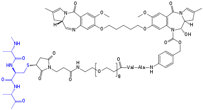 Chemical structure of "tesirine" (drawn in black). It consists of a pyrrolobenzodiazepine type dimer (top), which is the actual anti-cancer agent, a Val–Ala structure that can be cleaved by an enzyme to detach the anti-cancer agent from the antibody, a polyethylene glycol spacer, and a maleimide linker which is attached to a cysteine in the antibody's (rovalpituzumab's) peptide backbone, drawn blue. Each rovalpituzumab molecule has an average of two such attachments.[8]