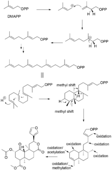 Subsequent addition of three 5-carbon IPP units to a single 5-carbon DMAPP unit generates the 20-carbon central precursor, geranylgeranyl diphosphate (GGPP). Bicyclization of GGPP by the class II diterpene synthase, ent-clerodienyl diphosphate synthase (SdCPS2), produces an Iabdanyl diphosphate carbocation, which is subsequently rearranged through a sequence of 1,2-hydride and methyl shifts to form the ent-clerodienyl diphosphate intermediate.[28] SdCPS2 catalyzes the first committed reaction in the biosynthesis of salvinorin A by producing its characteristic clerodane scaffold. A series of oxygenation, acylation and methylation reactions is then required to complete the biosynthesis of salvinorin A.