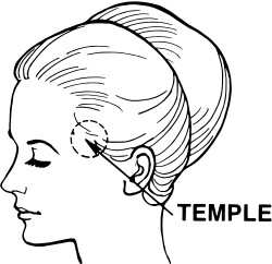 The temple is a juncture where four skull bones fuse together: the frontal, parietal, temporal, and sphenoid.[1] It is located on the side of the head behind the eye between the forehead and the ear. The temporal muscle covers this area and is used during mastication.