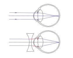 ഹ്രസ്വദൃഷ്ടി (മുകളിൽ), അനുയോജ്യമായ ലെൻസ് ഉപയോഗിച്ച് വൈകല്യം പരിഹരിച്ചിരിക്കുന്നു (താഴെ)