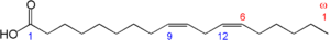 18 కార్బనులను కలిగిన, రెండు ద్విబంధాలున్న అసంతృప్త కొవ్వుఆమ్లం- లినొలిక్ ఆమ్లం