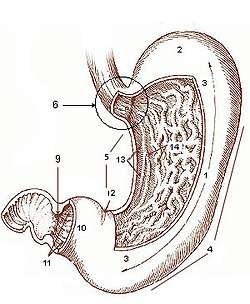| Diagram from cancer.gov: * 1. Body of stomach * 2. Fundus * 3. Anterior wall * 4. Greater curvature * 5. Lesser curvature * 6. Cardia * 9. Pyloric sphincter * 10. Pyloric antrum * 11. Pyloric canal * 12. Angular notch * 13. Gastric canal * 14. Rugal folds Work of the United States Government | |