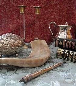 జుడైకా (పైనుండి సవ్యదిశలో): 'షబ్బత్' కొవ్వొత్తులు, చేతులు కడుగు పాత్ర, చుమాష్ మరియు తనఖ్, తోరాహ్ చూపుడు కట్టె, షోఫర్ మరియు ఎట్రాగ్ డబ్బా.
