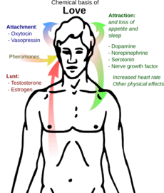 జతకూడటాన్ని ప్రోత్సహించే ఆకర్షణీయ కోరికల యొక్క ప్రారంభ దశ అయిన తీవ్రమైన శారీరక వాంఛలో టెస్టోస్టెరోన్ మరియు ఈస్ట్రోజెన్ వంటి రసాయనాలు అధికంగా విడుదలౌతాయి. ఈ ప్రభావాలు కొన్ని వారాలు లేదా నెలలు మాత్రమే ఉంటాయి.ఆకర్షణ అనేది జతకూడుటకు ఒక ప్రత్యేక వ్యక్తి పట్ల వ్యక్తి పరమైన మరియు వూహాజనిత కోరిక, మరియు ఇది శారీరక వాంఛ నుంచి ఉద్భవించి జత కూడే వైఖరుల పట్ల నిబద్ధతను పెంచుతుంది.న్యూరో సైన్సులో ఇటీవల పరిశోధనలు, ప్రేమలో పడిన వ్యక్తి యొక్క మెదడు అమ్ఫిట మైన్స్ వలెనె పనిచేసే, మెదడు యొక్క ఆనంద కేంద్రాన్ని ఉత్తేజ పరచి, హృదయ స్పందనను పెంచి,నిద్రాహారాలను తగ్గించి, తీవ్రమైన ఉత్తేజాన్ని కలిగించే రసాయనాలైన ఫేరోమోన్స్, డోపమిన్, నోరేపిన్ఫ్రిన్, మరియు సరోటోనిన్, వంటి వాటిని విడుదల చేస్తుందని సూచించాయి.పరిశోధనలు ఈ దశ సాధారణంగా ఒకటిన్నర సంవత్సరం నుండి మూడు సంవత్సరాల వరకు ఉంటుందని సూచించాయి.[6]