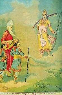 దశరథ రామా! నీవు శివుని విల్లు విరచిన వృత్తాంతాన్ని విన్నాను. ఇదిగో నా ధనుస్సు జామదగ్న్యాన్ని ఎక్కుపెట్టి, బాణం తొడిగి నీ బలం చూపు. అపుడు నీతో ద్వంద్వ యుద్ధం చేస్తాను – అని భార్గవరాముడు దశరథరాముని ఆక్షేపించాడు. దశరథుని అభ్యర్ధనలను లెక్కచేయలేదు. శివధనస్సుతో సమానంగా చేయబడిన తన విష్ణు ధనస్సును ఎక్కుపెట్టి చూపమని మళ్ళీ అన్నాడు. క్రుద్ధుడైన రాముడు అవలీలగా పరశురాముని ధవస్సుకు బాణం తొడిగాడు. దివ్యాస్త్రం వృధా కారాదు గనుక పరశురాముని పాదగతిని కానీ, లేదా అతను తపస్సుతో సాధించుకొన్న లోకాలను గానీ ఏదో ఒకటి నాశనం చేస్తానని చెప్పాడు.