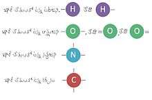 | సంయోజక సామర్థ్యాలు | ఉదజని 1 | కర్బనం 4 ఉదజని 1 | కర్బనం 4 ఉదజని 1 | కర్బనం 4 ఉదజని 1 | నత్రజని 3 ఉదజని 1 | సోడియం 1 కర్బనం 4 నత్రజని 3 | గంథకం 2 ఉదజని 1 | గంథకం 6 ఆమ్లజని 2 ఉదజని 1 | క్లోరిన్ 7 ఆమ్లజని 2 |