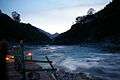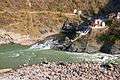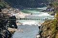 ![]() Confluence of Alaknanda (bottom, from right) and Mandakini River (flowing from top - North) at Rudraprayag. Before 17 June 2013, there was a footbridge (jhula) over the Mandakini; this was washed away in the 2013 Uttarakhand floods. The stones at the bottom of the stairs were not there; instead, there was a viewing platform, and a large rock called Narad Shila. | |