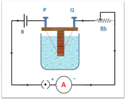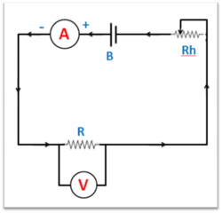 - ఒక బ్యాటరీ,ఒక అమ్మీటరు,ఒక నిరోధం,ఒక రియోస్టాట్ లను శ్రేణి సంధానంలో కలపాలి. ఒక వోల్టు మీటరును నిరోధం నకు సమాంతరంగా కలపాలి.