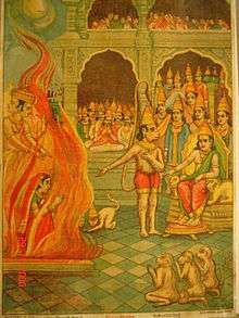 సీత లక్ష్మణునివైపు తిరిగి "లక్ష్మణా, కళంకిని యనిపించుకొని నేనింక బ్రతుకలేను. నా సుగుణాలని కీర్తించని నా భర్త నలుగురిముందు నన్ననరాని మాటలన్నాడు. అగ్నిని ప్రజ్వలింపజేయి" అన్నది. సీత అవనత శిరస్కయై రామునకు, దేవతలకు, దిక్పాలురకు మ్రొక్కి "నా హృదయం సదా రామచంద్రుడినే పూజిస్తున్నట్లయితే సర్వభక్షకుడైన అగ్ని నన్ను పునీతురాలిని చేయాలి" అని పలికి మంటలలోనికి నడచింది. అందరూహాహాకారాలు చేశారు. అప్పుడు బ్రహ్మ రాముని సమక్షంలో నిలిచి "రామా నువ్వు లోక కర్తవు. ఉత్తమ జ్ఞానివి. అలా చూస్తూ ఊరుకుంటావేం? ప్రాకృతునిలా సీతను ఉపేక్షిస్తావేమీ" అన్నాడు. నీవు విష్ణువు అవతారానివని చెప్పాడు.